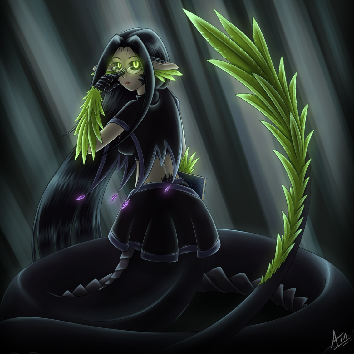 Her decorative feathers aren't something you would usually find in lamias, even her mother didn't really understood why she have such peculiarity. Atharya usually wears scarce clothing, shades of purple and black, and a distinctive tribal look when she's out in the jungle or in places where she doesn't need to hide her monstruous nature.